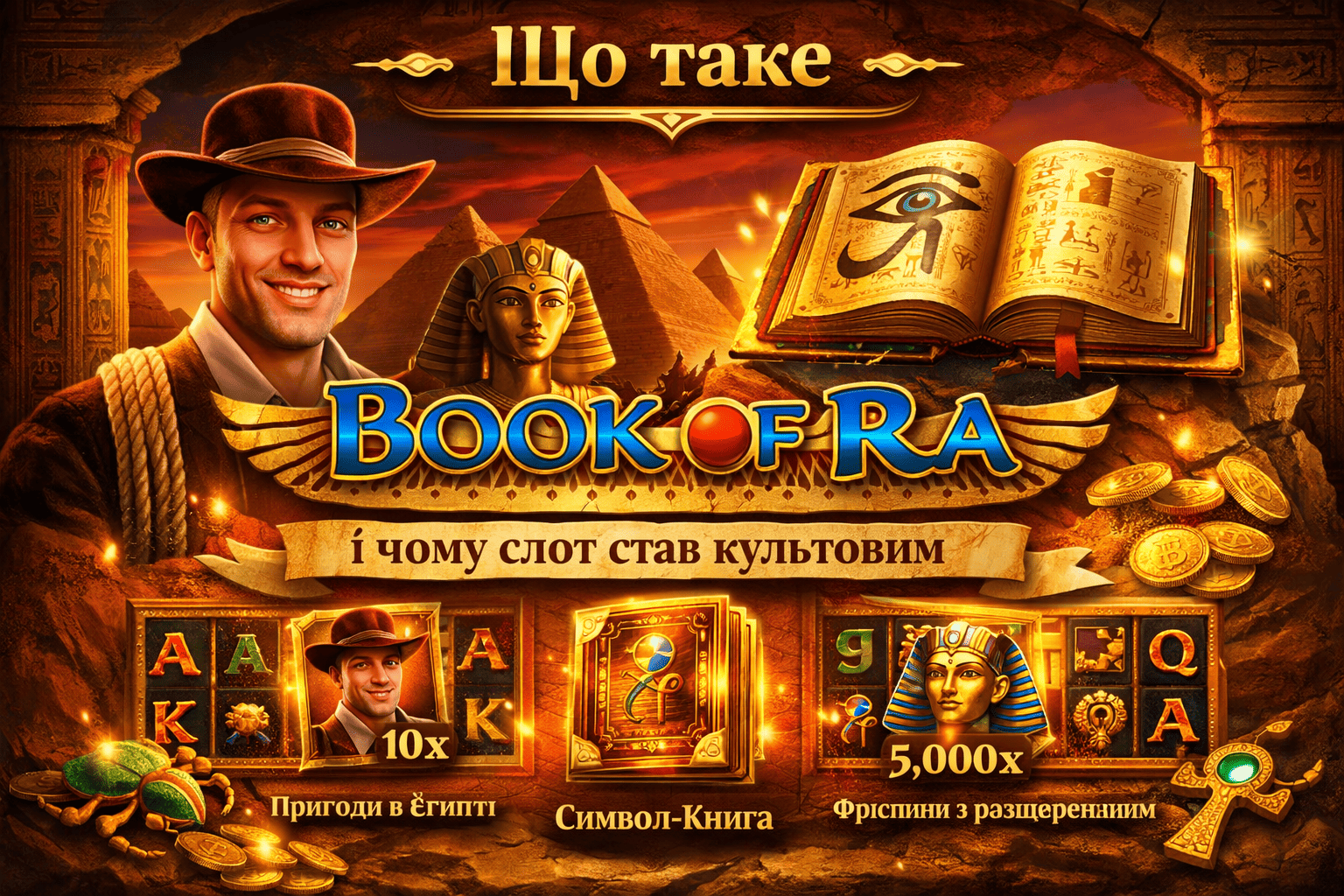 Дослідник, фараон, скарабей, статуя Гора, книга Ра та карткові символи, а також їхня роль у формуванні виграшних комбінацій